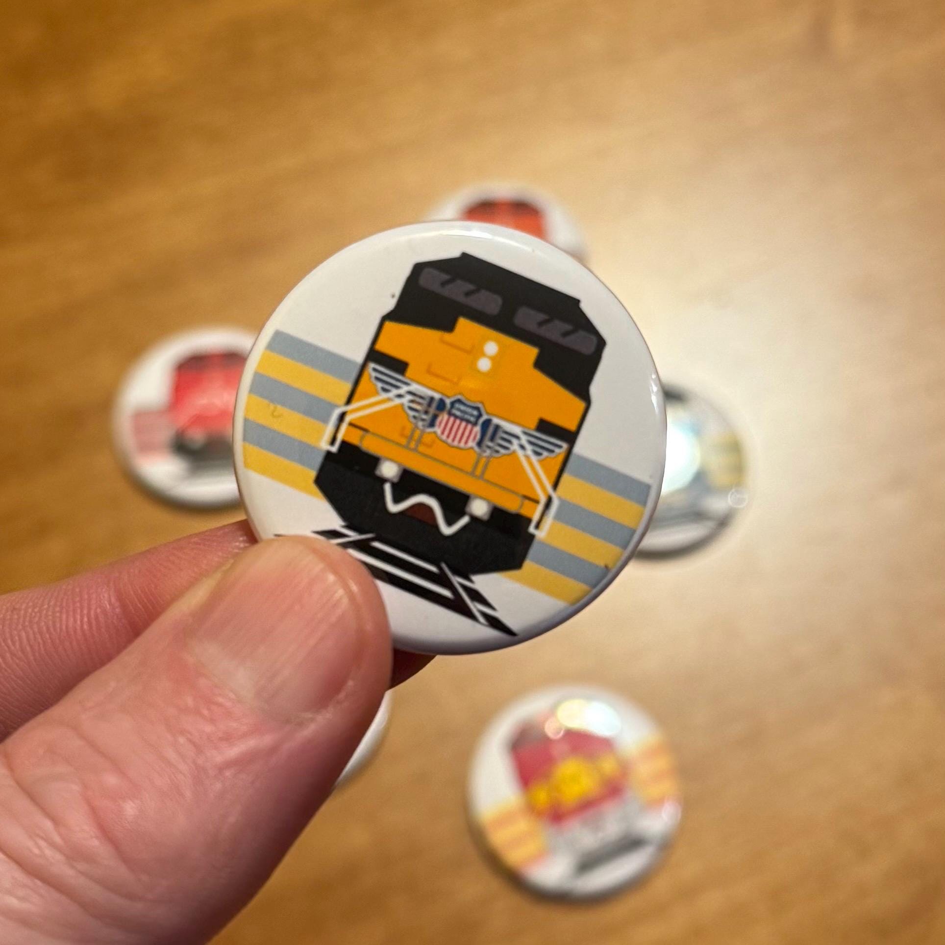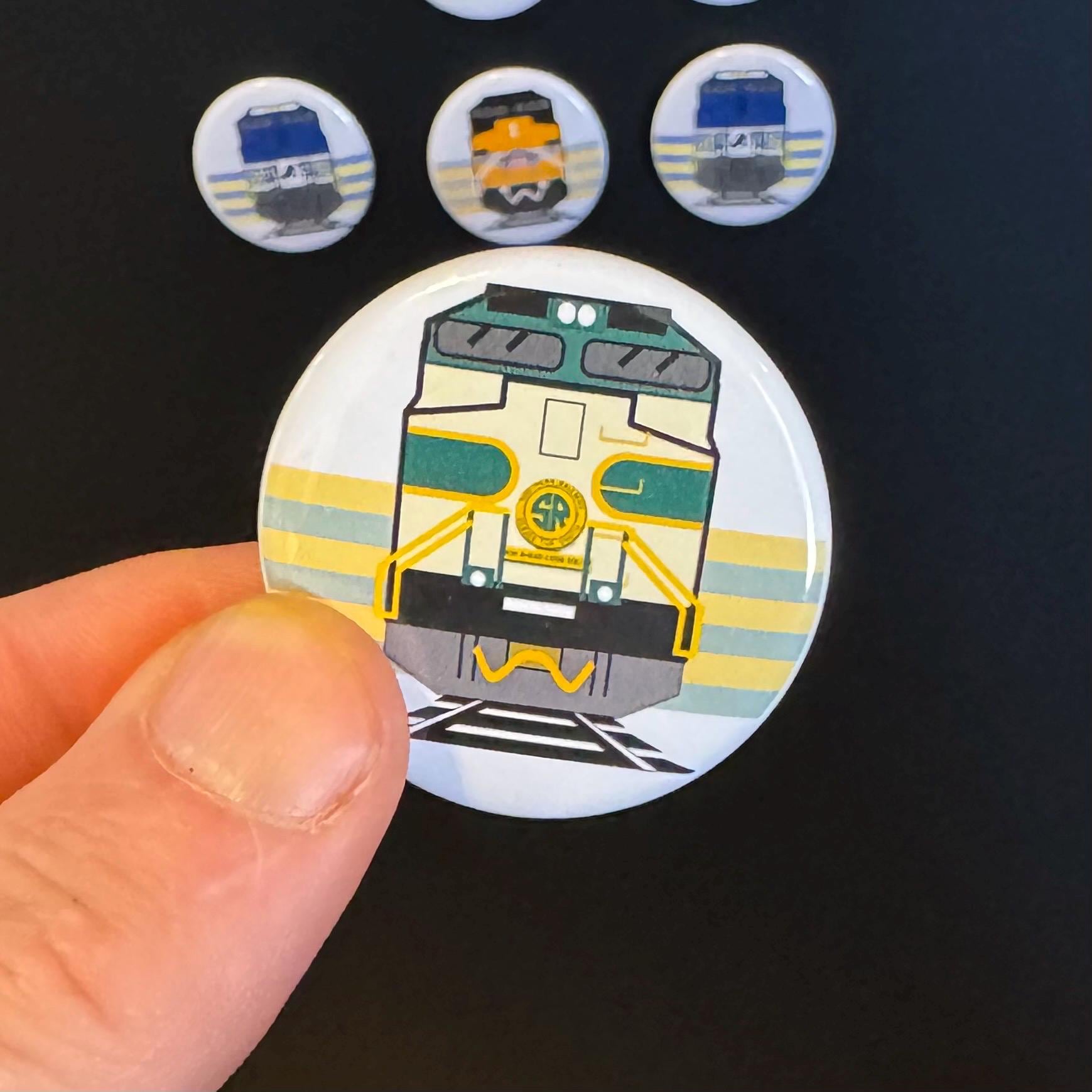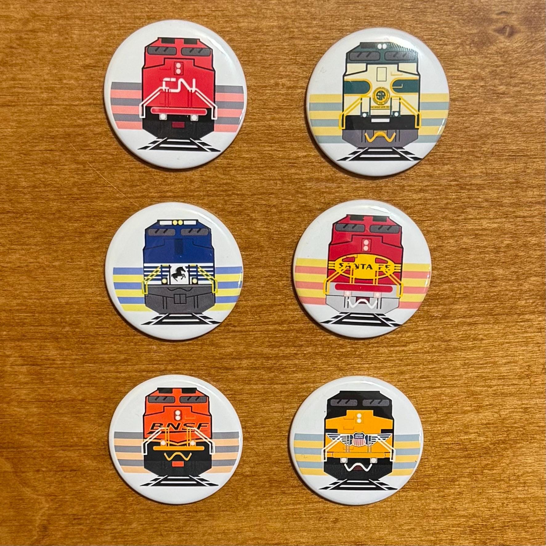 Train Magnet Button Pack. Pack of 6 train buttons. Illustrated and hand-pressed right here by us. Great unique gift for railfans.
