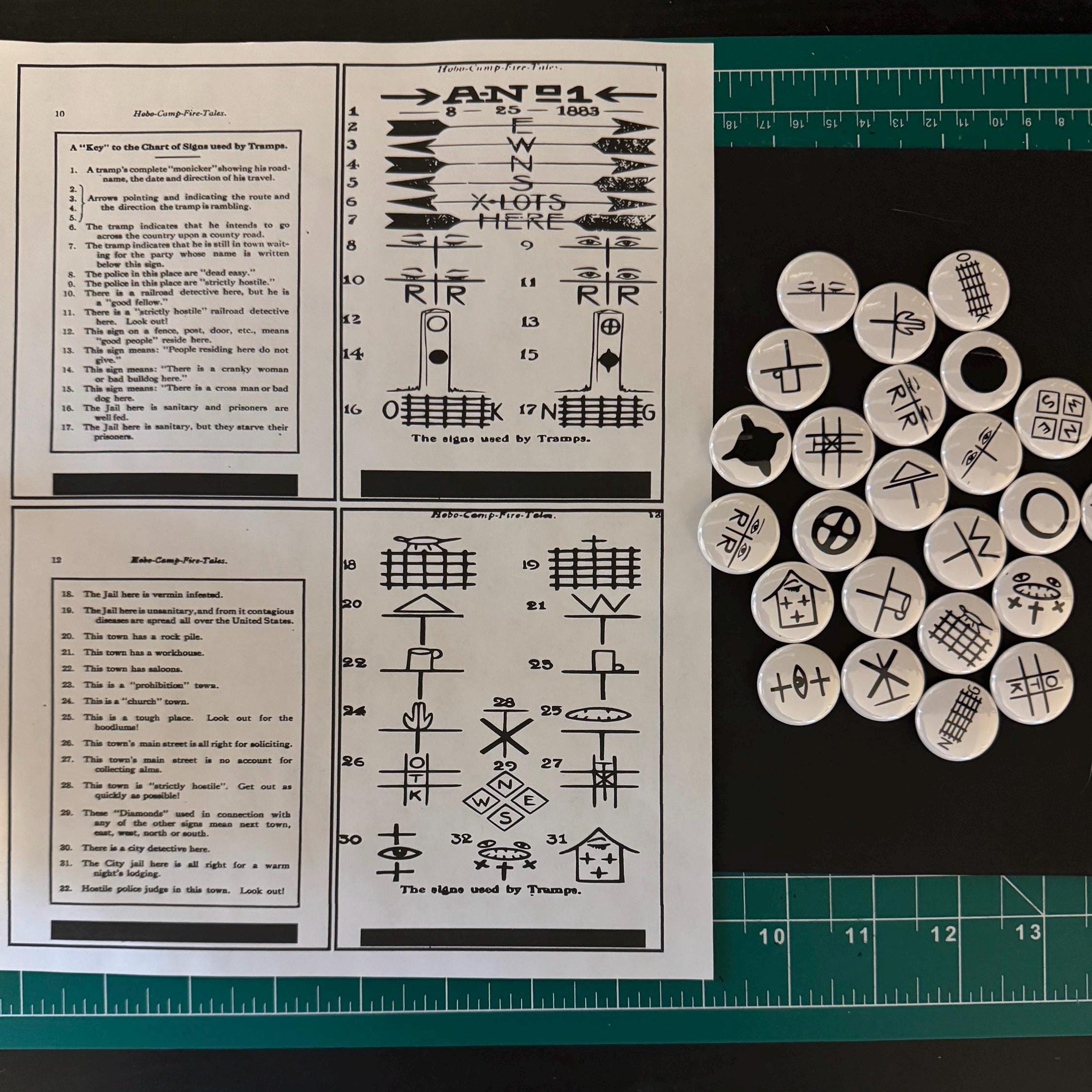 Step back into the fascinating world of American folklore with this striking set of 25 Hobo Code buttons. Each button features the hand-drawn symbols from the mysterious language once used by traveling workers and train-hopping wanderers of the late 19th and early 20th centuries. These captivating icons represent a hidden chapter of history—one rooted in adventure, survival, and a unique community spirit.