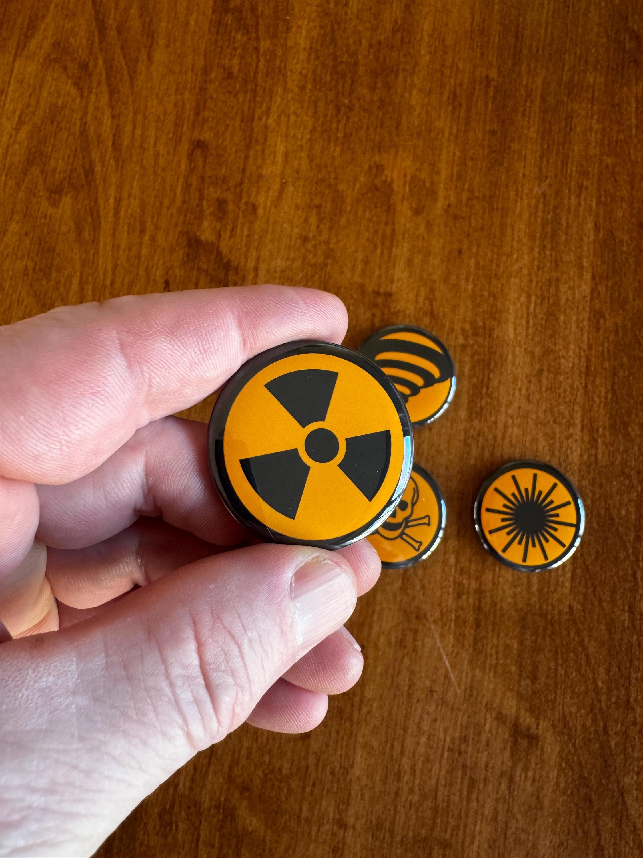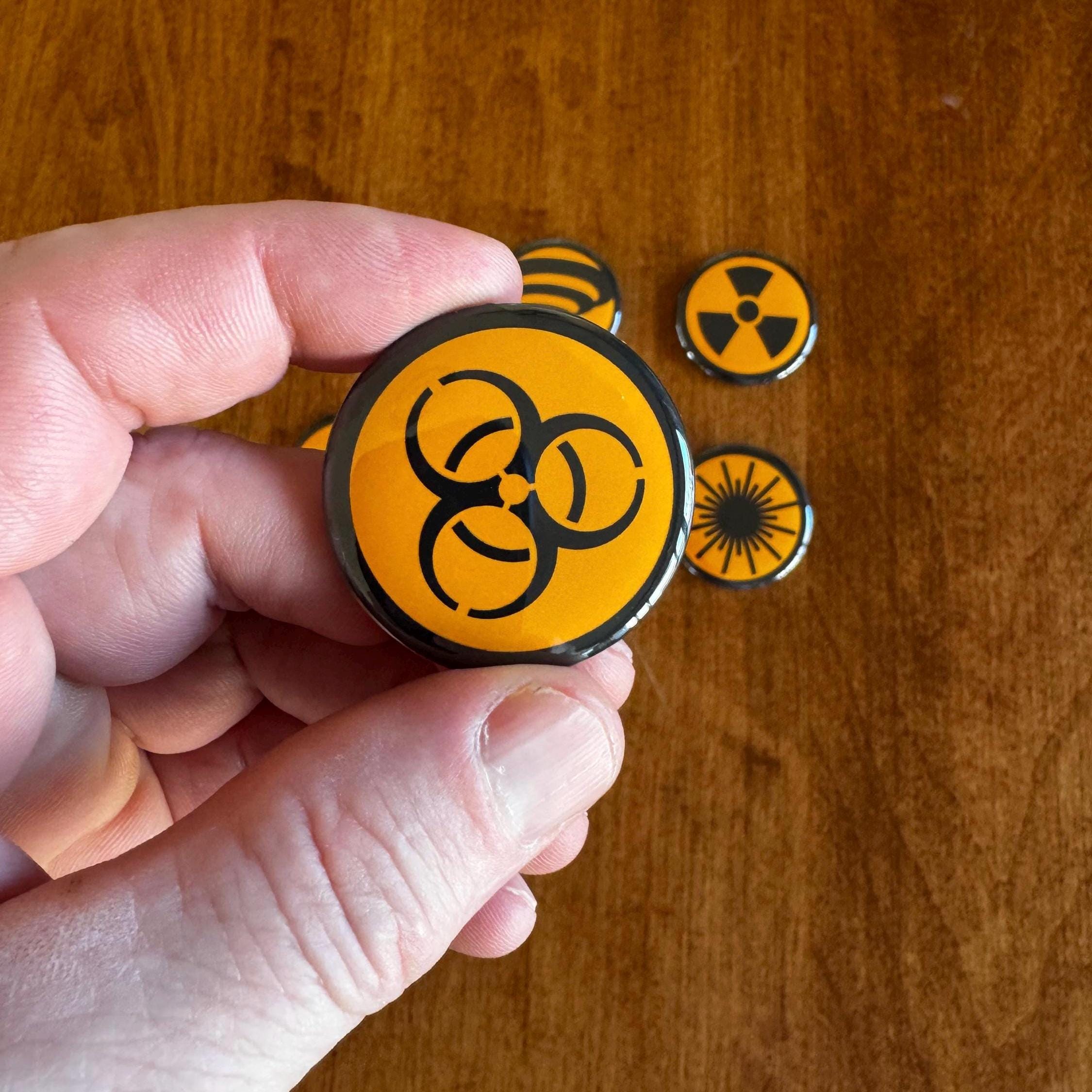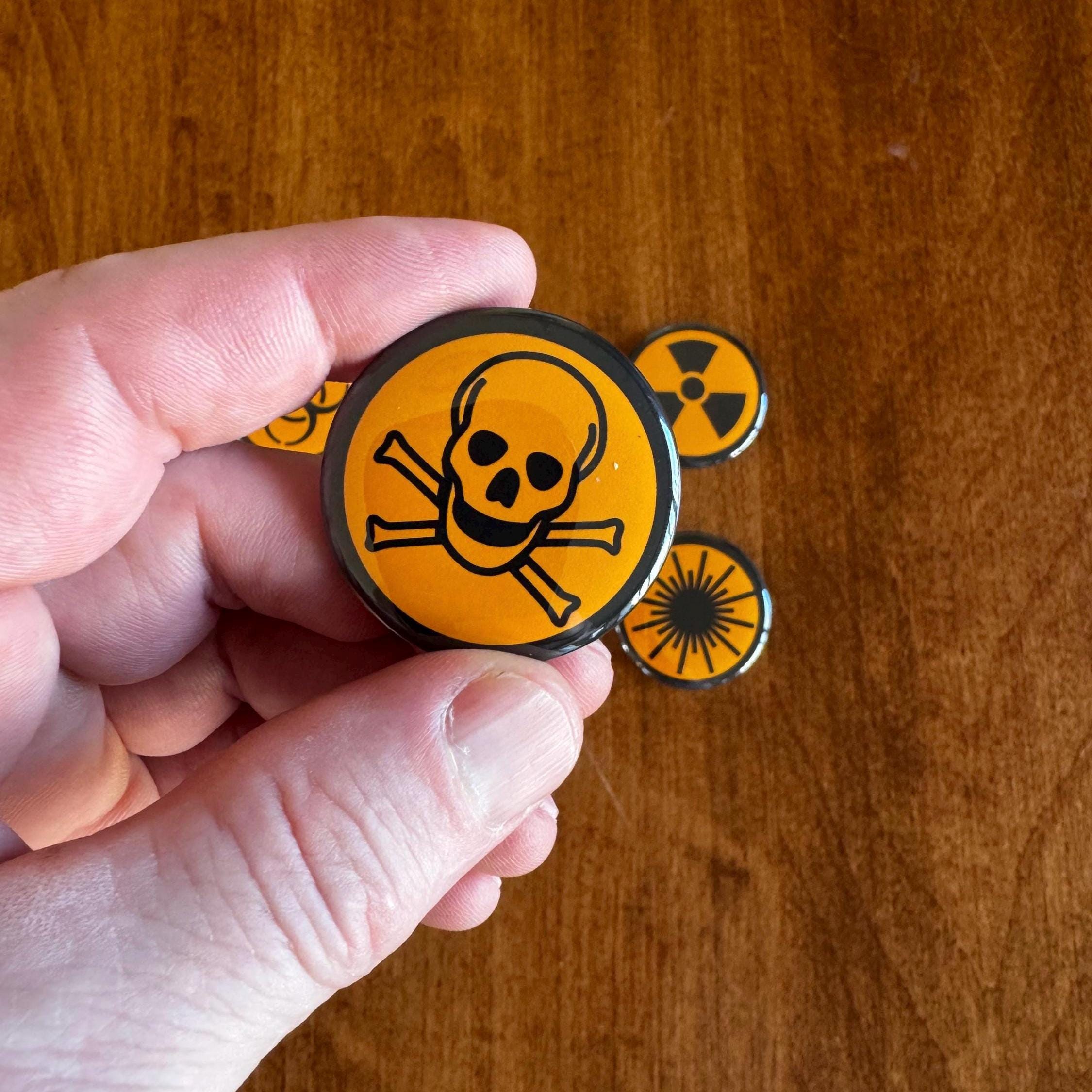 Hazard Symbol Button Magnet Pack. 6-pack of 1.5” round metal refrigerator magnets.