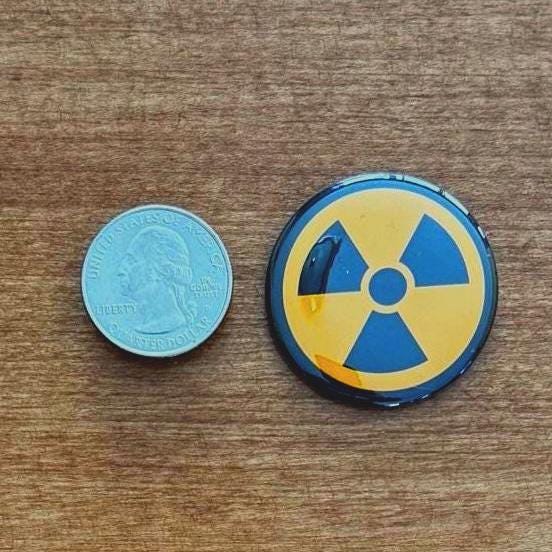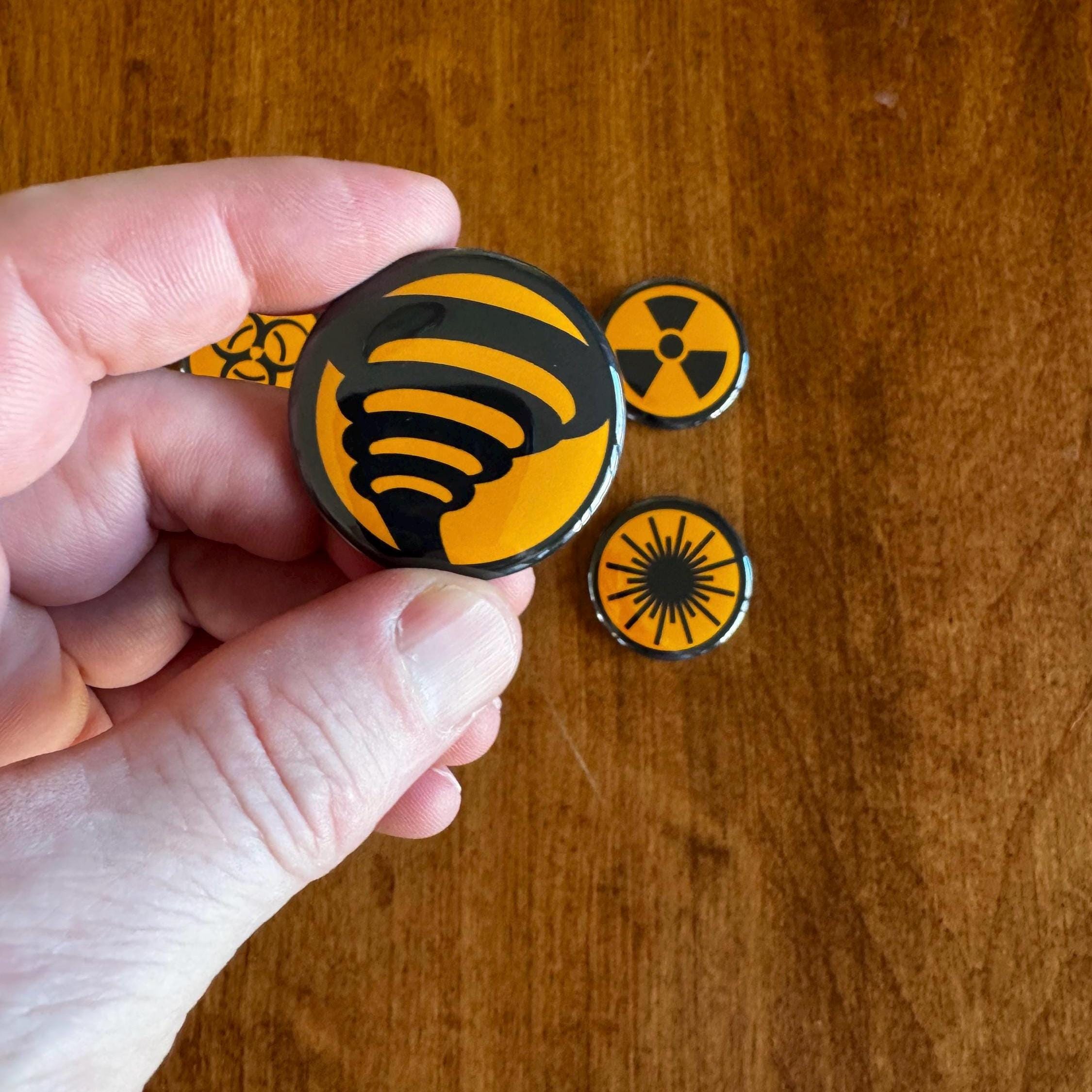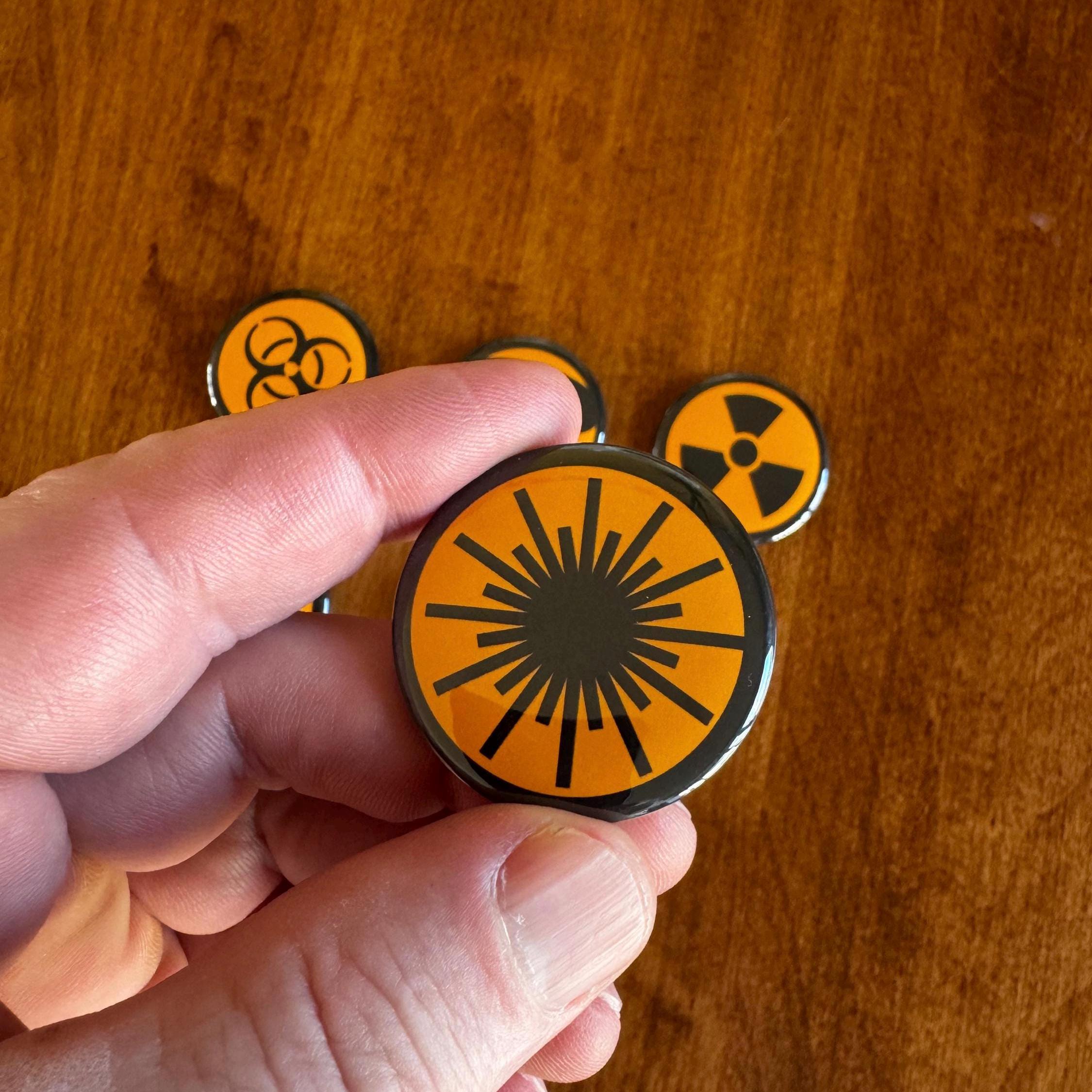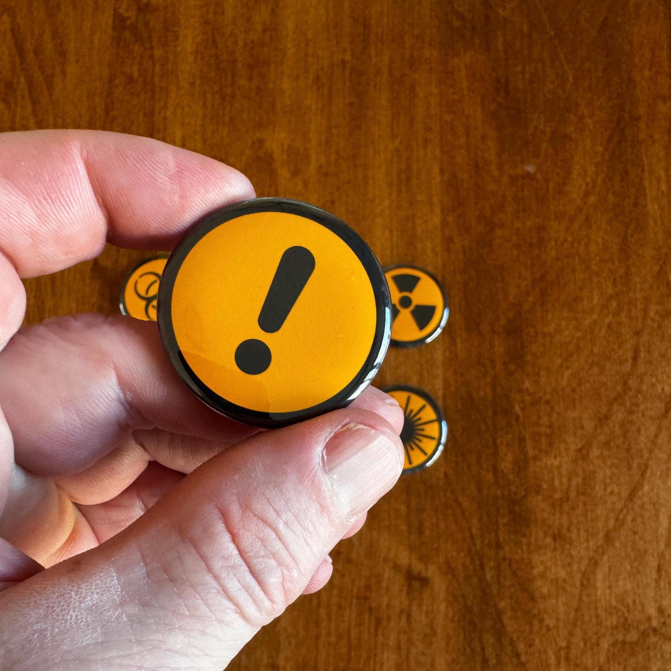 Hazard Symbol Button Magnet Pack. 6-pack of 1.5” round metal refrigerator magnets.