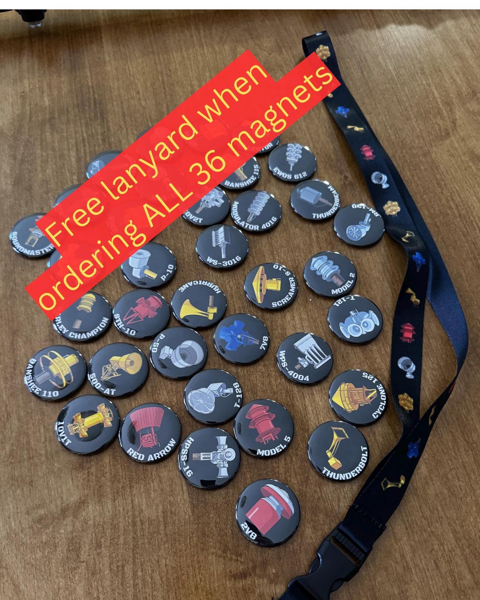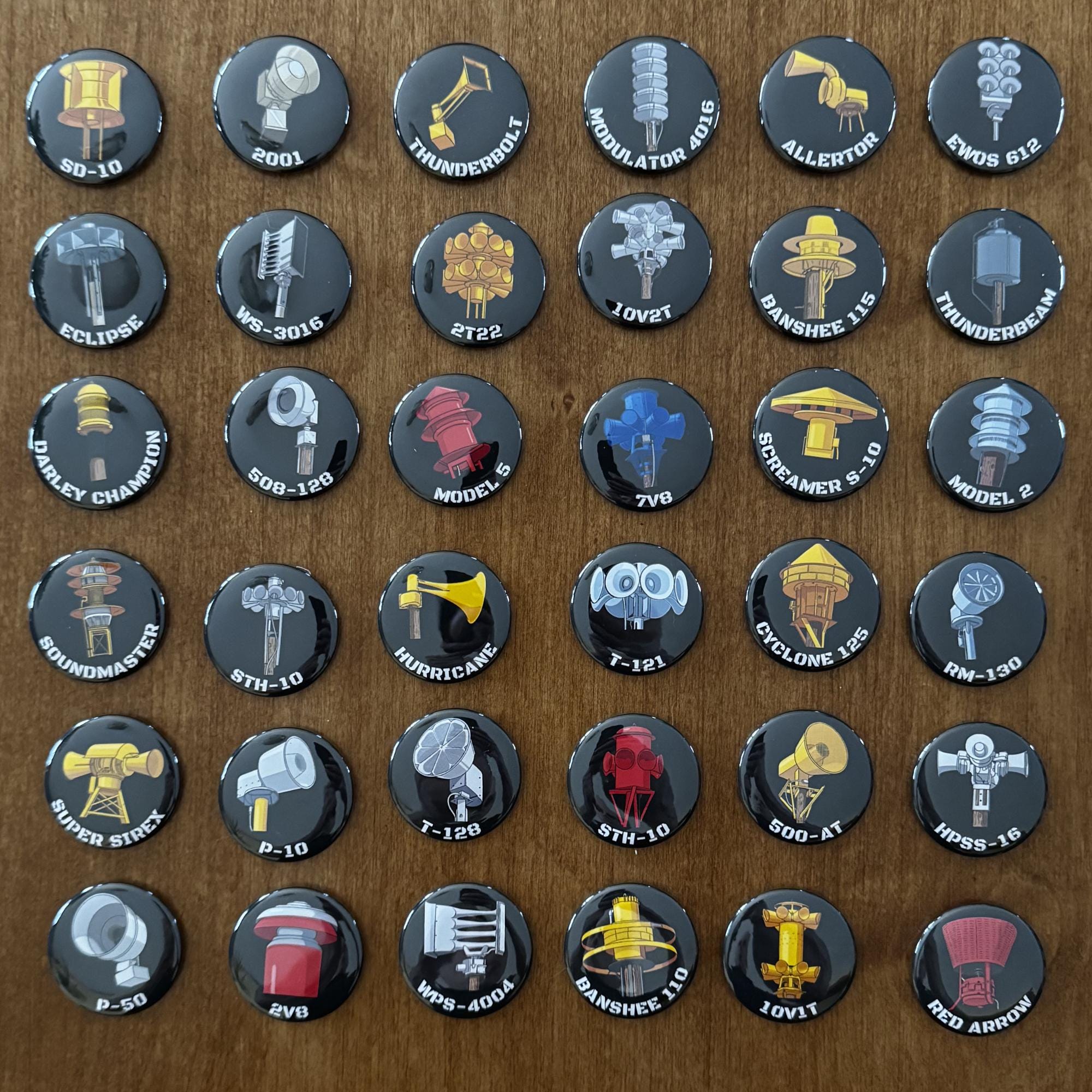 Tornado Siren Magnets with model name labels.
